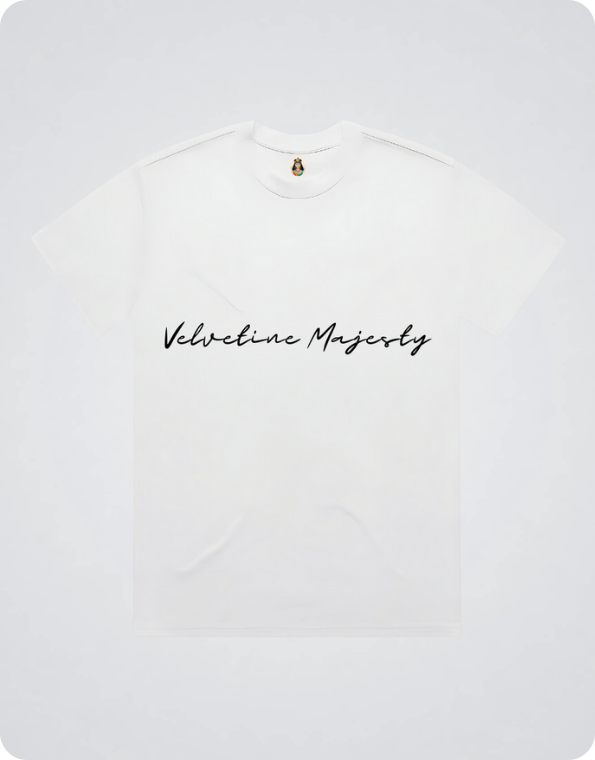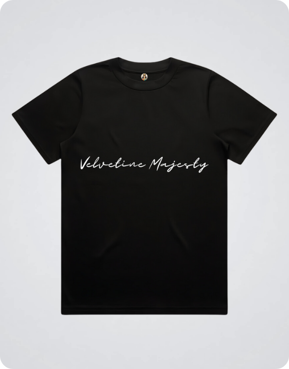 Experience ultimate luxury with this sleek black T-shirt, featuring the Velvetine Majesty name across the chest and our official logo on the back. Crafted from Supima cotton, it combines unparalleled softness with a refined, tailored fit.